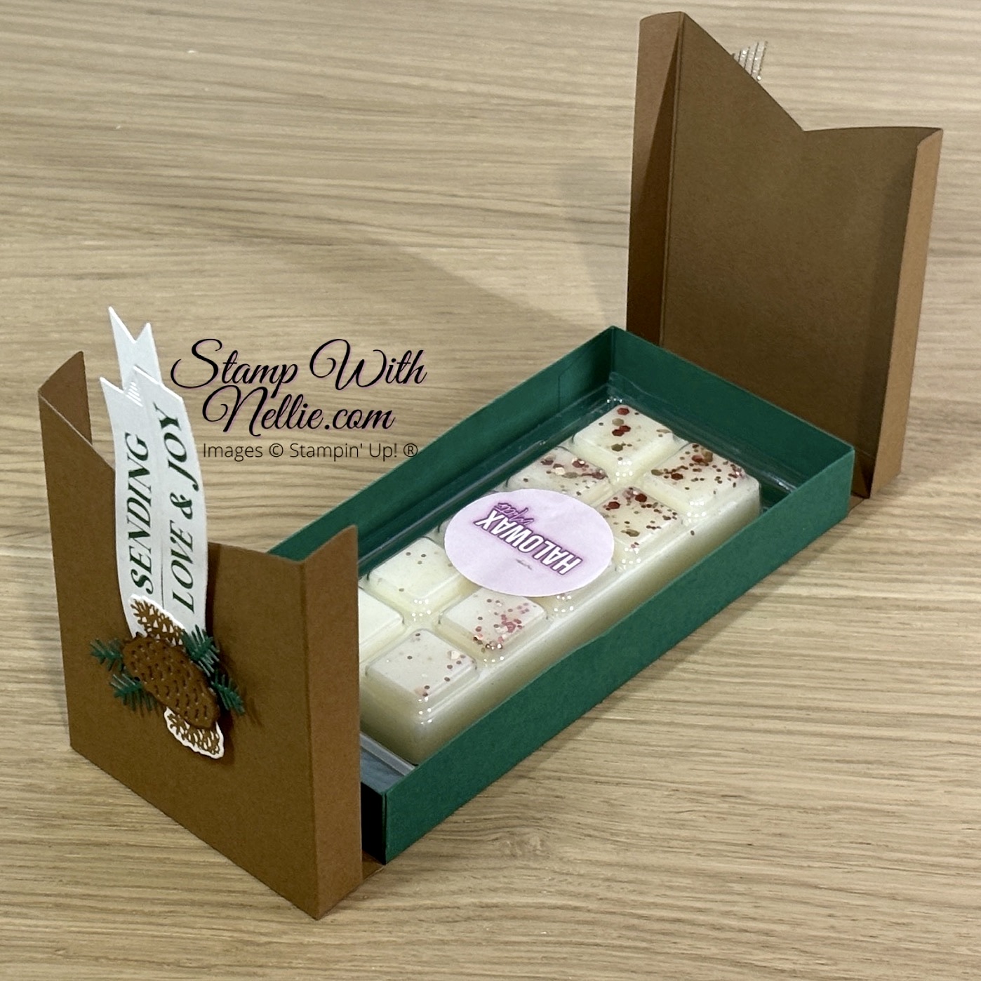 I created my box base with Shaded Spruce card and it’s essentially just a shallow tray to fit the pack of wax melts I want to gift. The lid is a whole other level though; as this is how it opens…