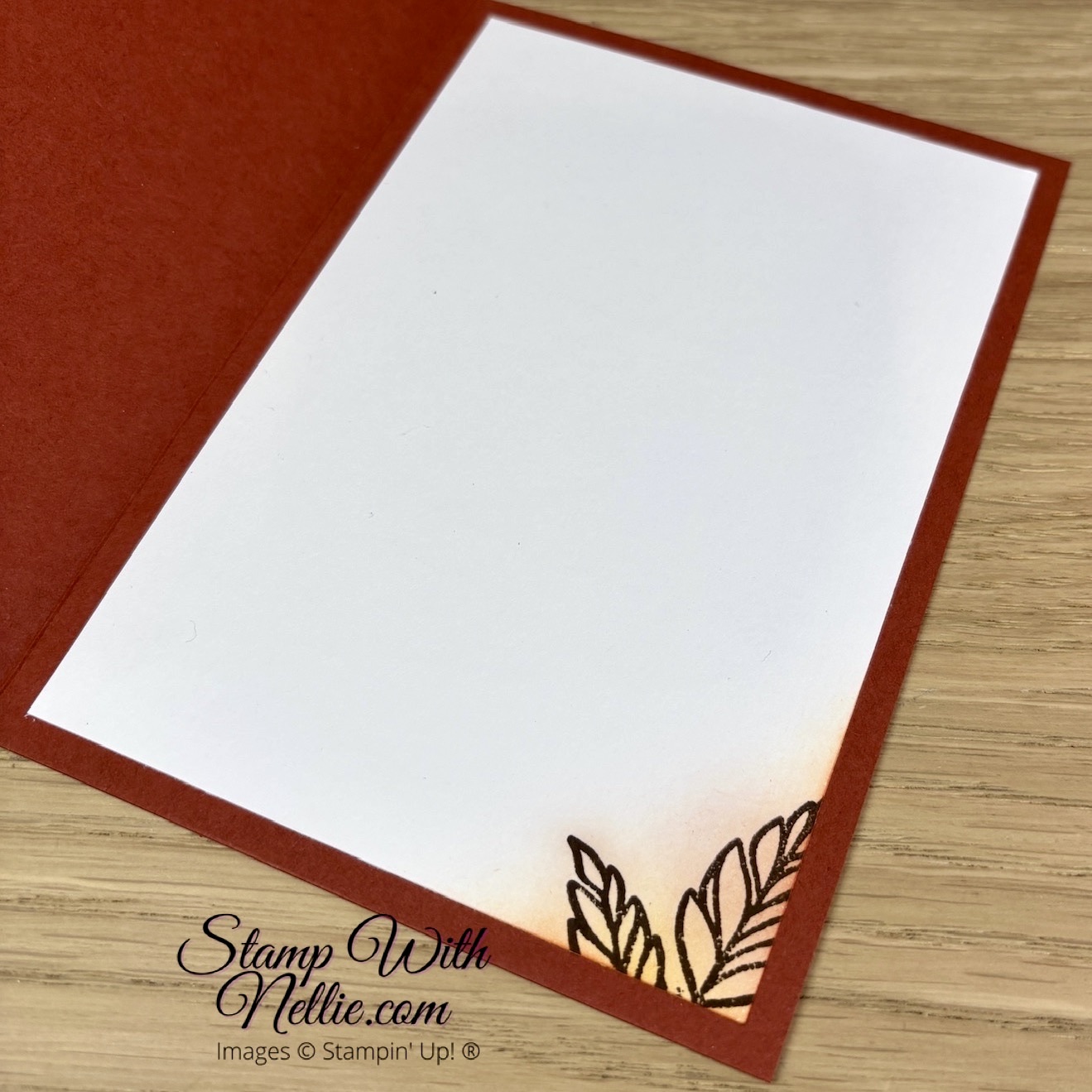 Then I stamped leaves from the Natural Botanicals stamp set with Early Espresso, Mossy Meadow and Cherry Cobbler on top. Finally, for this layer, I used Pecan Pie, Timid Tiger and Mossy Meadow Stampin’ Blends to spatter some ink spots all over. I really think this gives the background more texture.