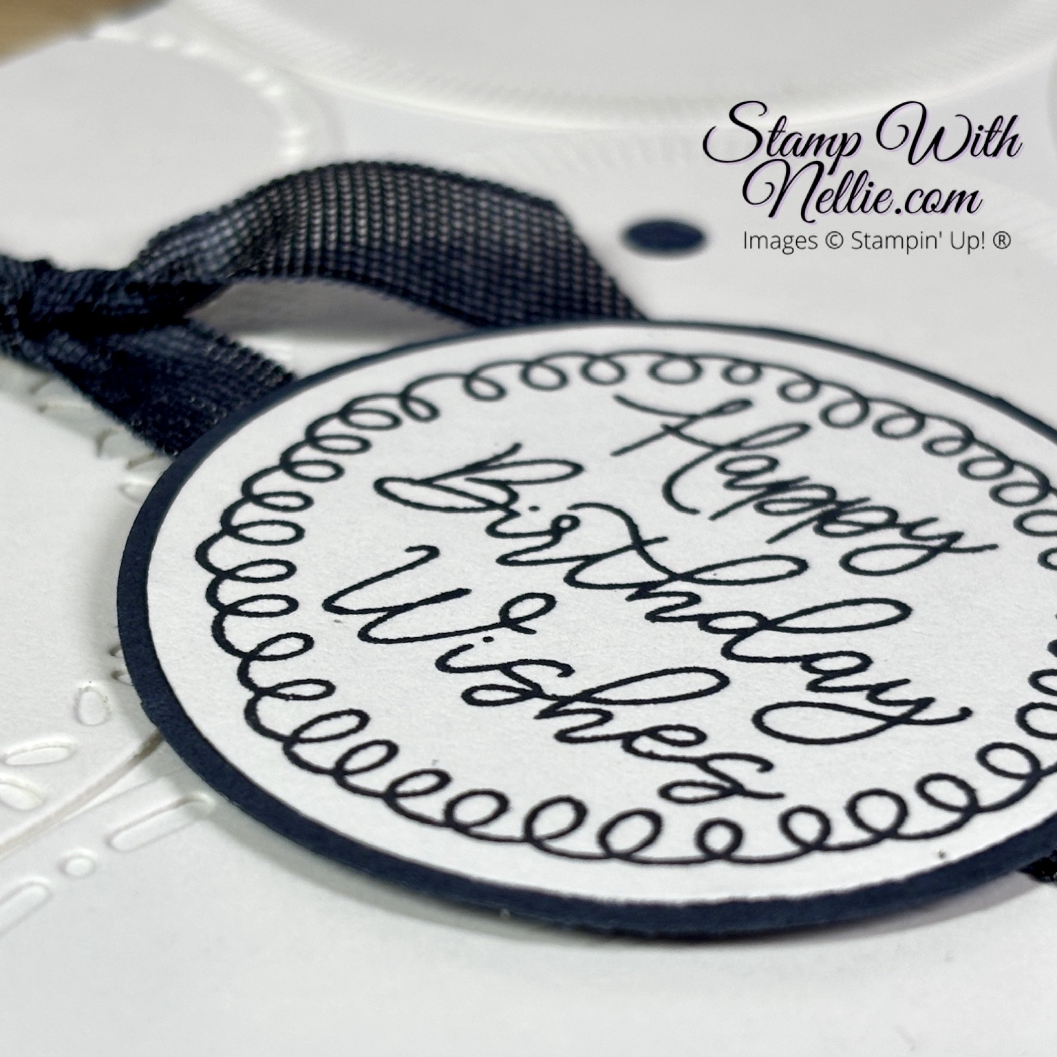 This sentiment is stamped with Secret Sea ink and cut with the 1-7/8″ circle punch then backed with a 2″ circle of Secret Sea card. In my video I show you a tip for making sure you use the best sized punch for the job.
