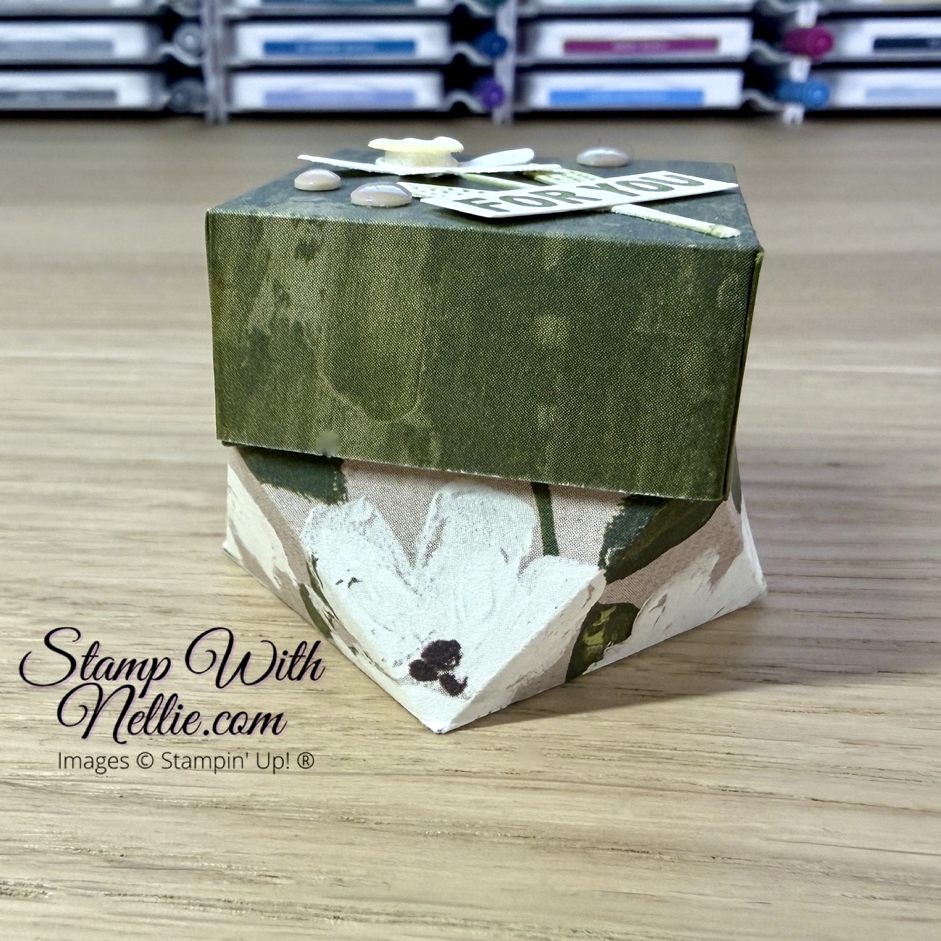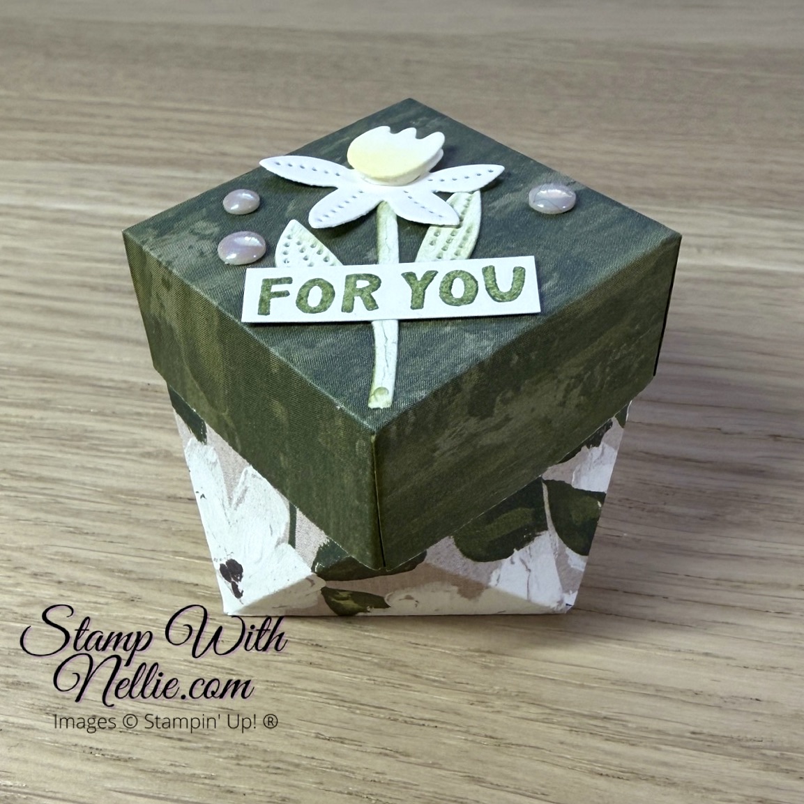 The Brushed With Beauty designer series paper is gorgeous. I love all the painted textures, flowers and blossoms. It seemed a cute choice for this fun little box.