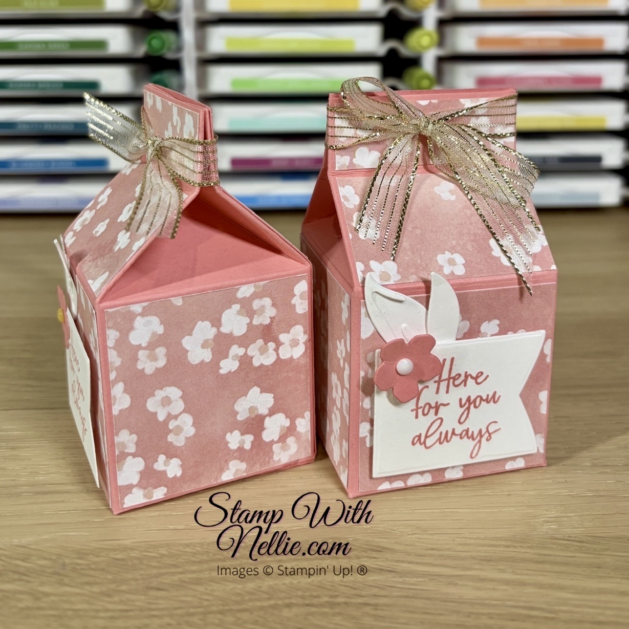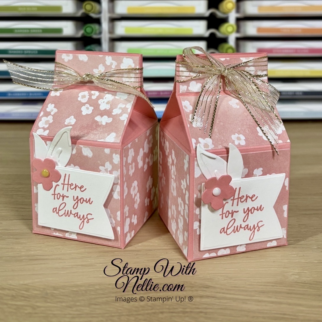 We used the February 2026 Product of the Month, the beautiful Painted Illusions designer series paper to decorate our Flirty Flamingo milk carton boxes. The sentiment label was created with the smallest die from the Party Banner set. I chose to stamp mine with a sweet sentiment from Friendly Foliage. And those little leaves and flower were created by using dies from Delightful Wishes. This just goes to show how easy it is to mix and match your old favourite products with this pretty new paper.