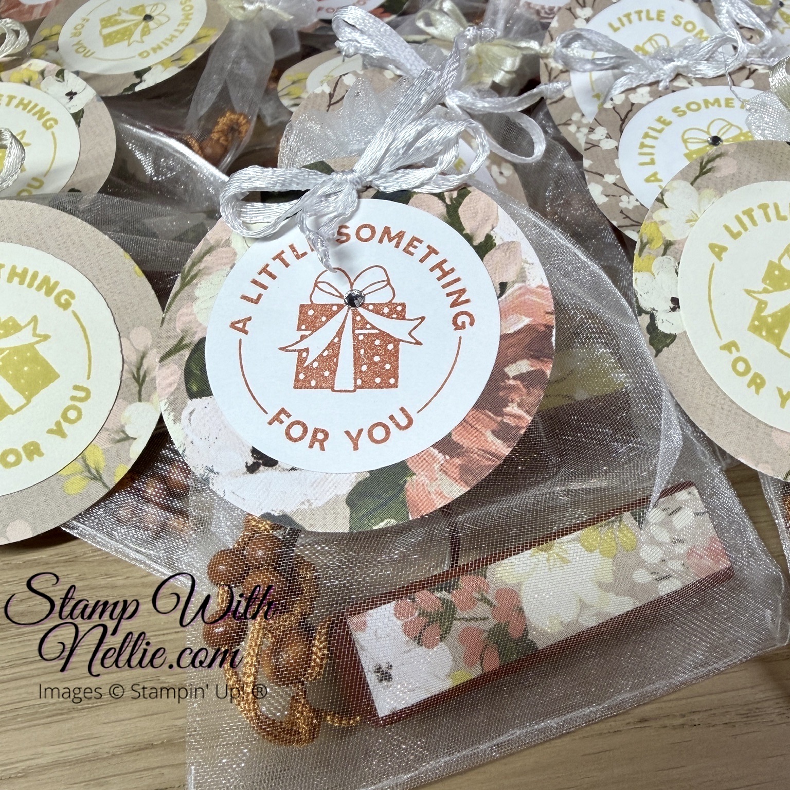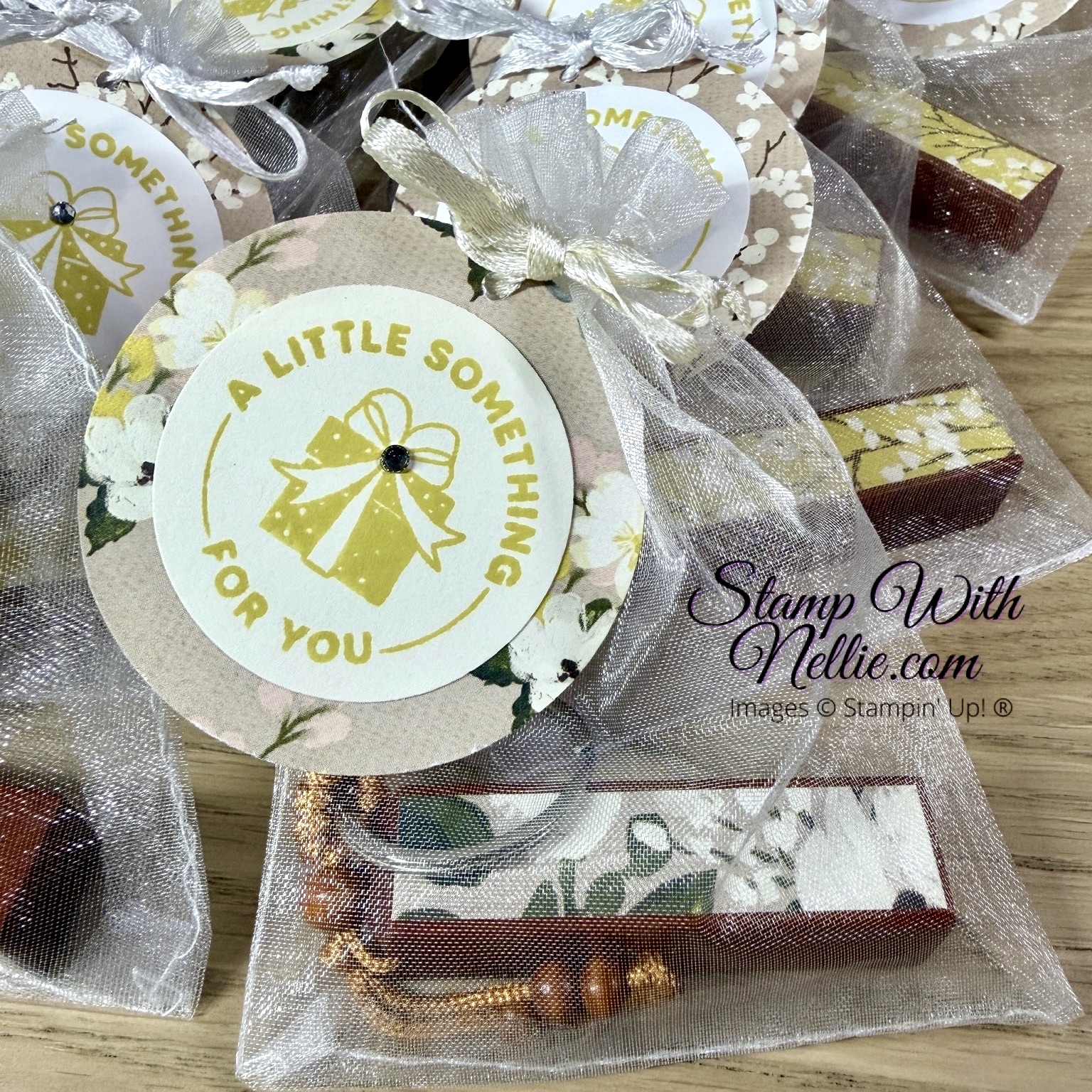 Then I found some white and cream organza bags to pop them into. And decided I should add a little tag. The Encircled With Love stamp was perfect for the job. I stamped this with Darling Duckling ink on white card and cut it with the 1-3/4″ circle punch. Then I backed that with a 2-3/8″ circle of the Brushed With Beauty paper…